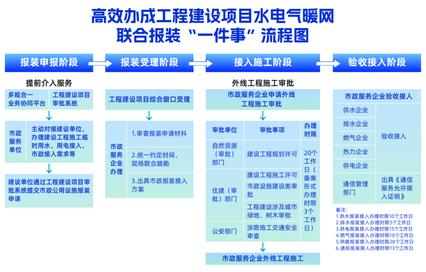 當前,市政報裝申請材料從18項精減為2項;外線工程申請材料從17項精減為6項;建設單位辦理水電氣暖網(wǎng)報裝接入從“多頭跑、往返跑”的11個環(huán)節(jié)變?yōu)椤耙患?、一次辦”。
