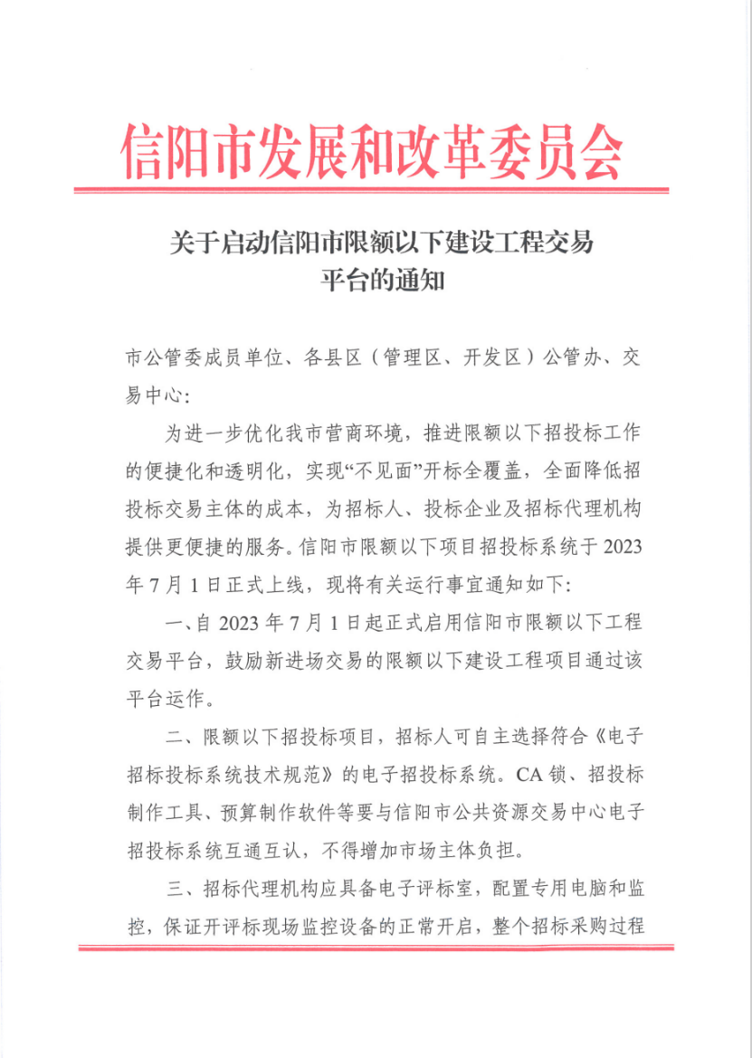 依據(jù)信陽市發(fā)展和改革委員會(huì)發(fā)布的《關(guān)于啟動(dòng)信陽市限額以下建設(shè)工程交易平臺(tái)的通知》,提出要鼓勵(lì)新進(jìn)場(chǎng)交易的限額以下建設(shè)工程項(xiàng)目通過平臺(tái)運(yùn)作,全面降低招投標(biāo)交易主體的成本,為各市場(chǎng)主體提供更便捷的服務(wù),營(yíng)造公開透明的營(yíng)商環(huán)境。目前,平臺(tái)的運(yùn)行工作已在信陽市全面鋪開。